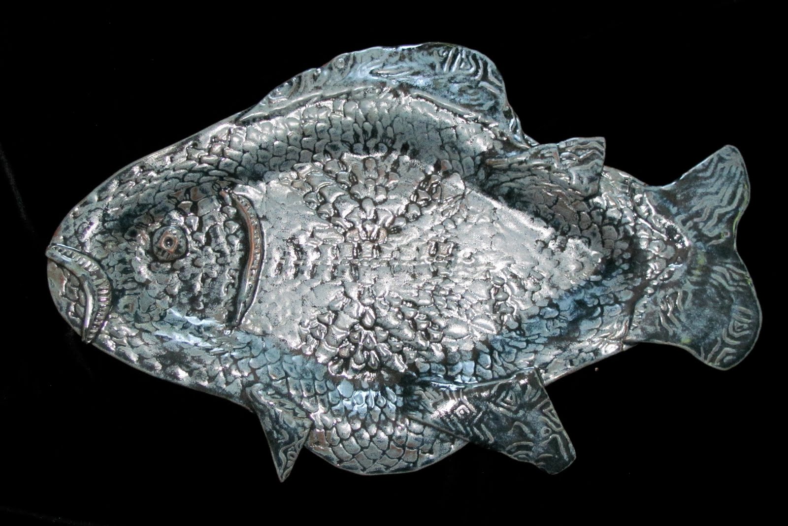 I'm very please with the way this glaze accentuates the textures and designs. Because it tends to run, it flows into crevices, darker where it pools, lighter and mottled where thinner over raised surfaces. This color variation gives the feeling of a shimmering fish just pulled from the ocean.